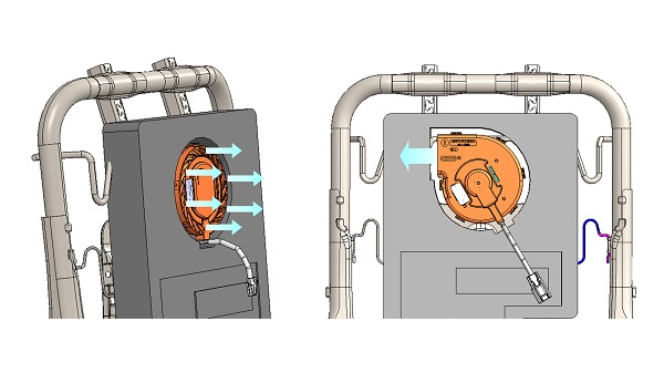 The DRF-29A306 EV-T XL offers a maximum flow of 34 CFM with a noise level of just 52 dB(A). This is achieved by ASPINA’s distinctive back-outlet design; a breakthrough that minimizes the aeroacoustic noise from the outlet while delivering exceptional airflow. This innovation is particularly valuable for applications with strict space limitations, as the direction of airflow remains confined within the blower’s compact footprint.