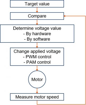 Schematically, the voltage control of a DC motor is composed of a motor drive circuit, a controller and a speed sensor. The signal from the speed sensor is fed back to the controller to control the motor speed at or close to the target (reference) speed.